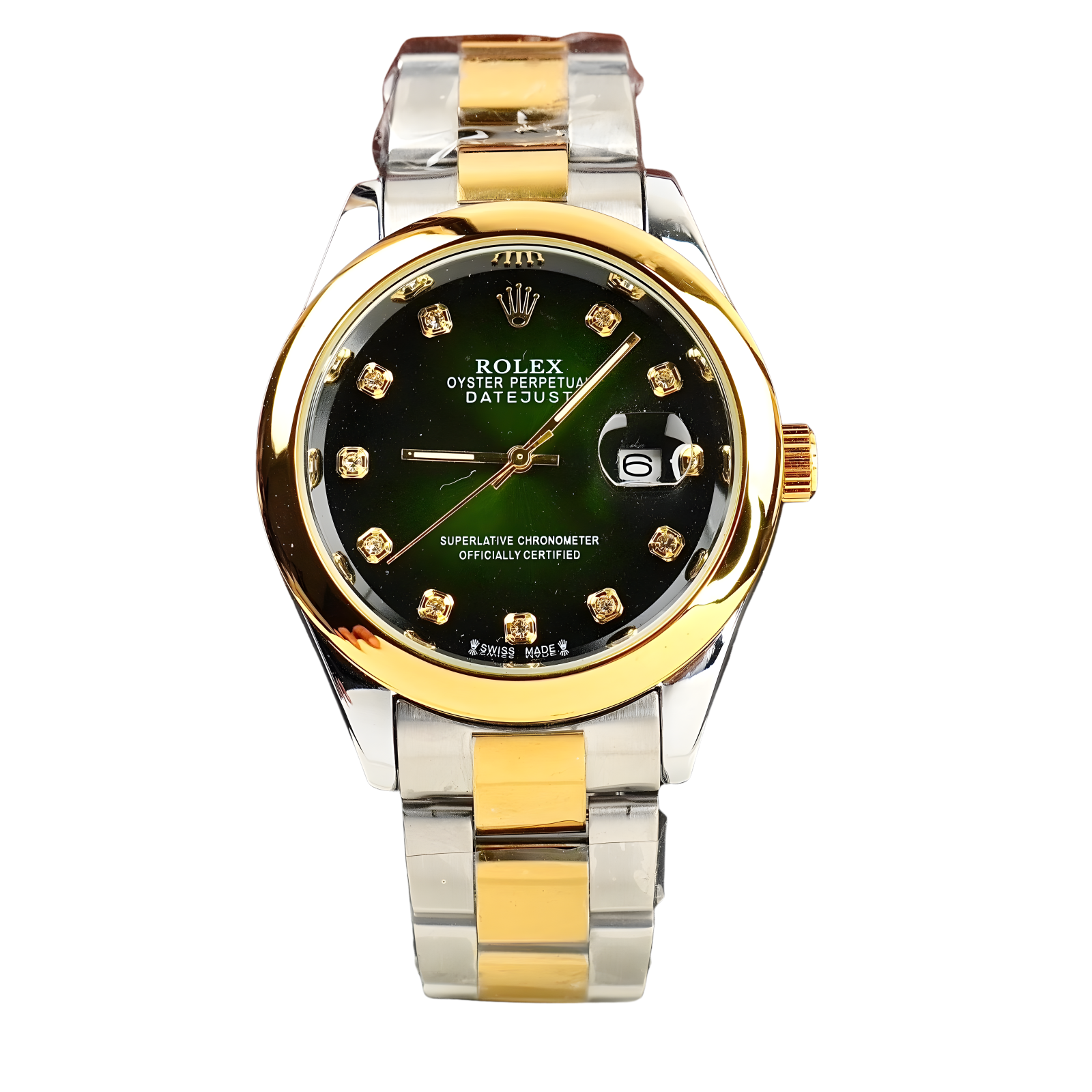 This luxury-inspired timepiece combines sophistication and performance — featuring a two-tone gold and silver stainless steel band, a rich emerald-green dial, and diamond-style hour markers that exude class.
